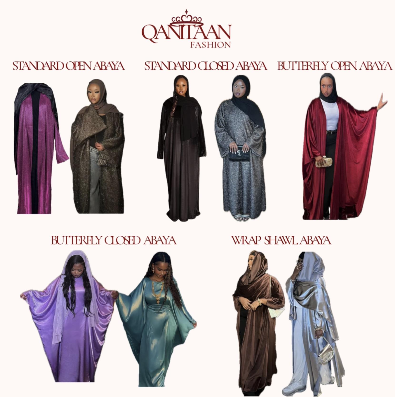 At Qanitaan, we offer five signature abaya styles, each crafted to honour your unique expression of modesty. Explore the silhouettes, experiment with structure and flow, and select the shape that defines your presence.