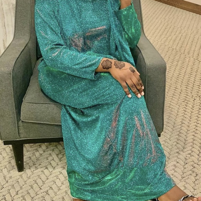 Bathed in an off-white shimmer that gleams like liquid moonlight, this set was crafted for moments that deserve all eyes on you. The flowing dress — with sleeves falling gracefully to the wrist — pairs seamlessly with an infinity loop scarf and matching undercap, creating a sculptural silhouette of elegance and power.