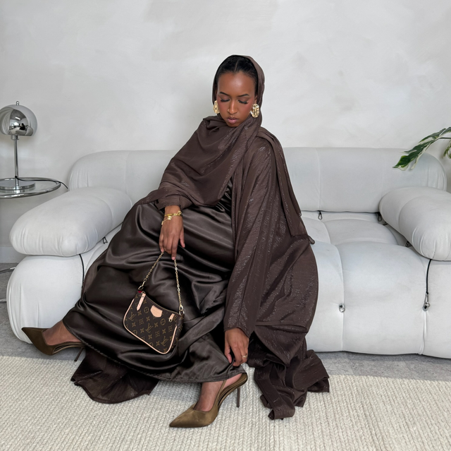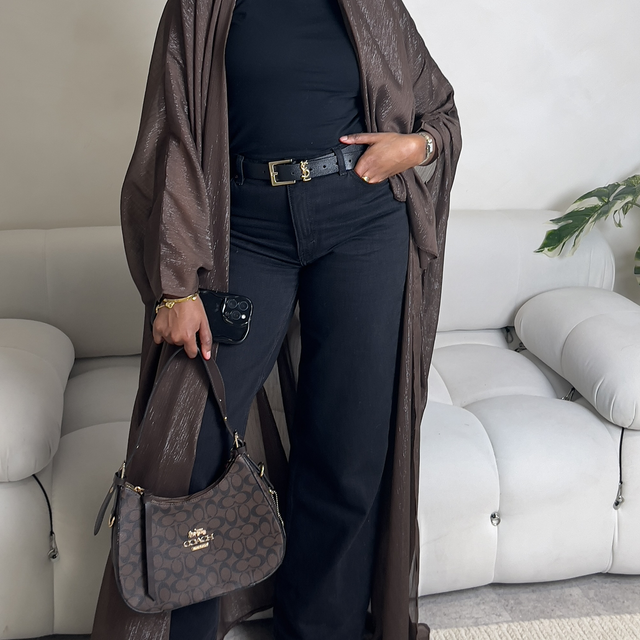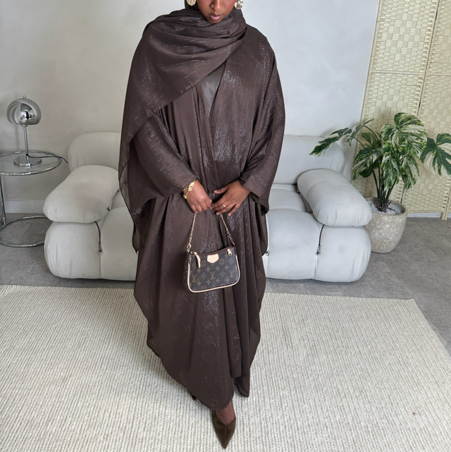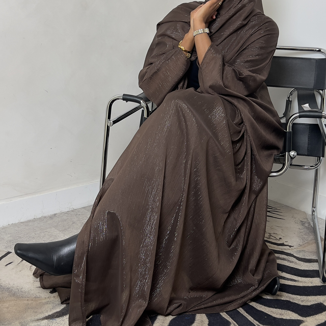 Our Crinkle Chiffon Abaya in Deep Brown captures the allure of timeless sophistication. The rich chestnut hue glows softly as silver streaks glimmer through its delicate folds, reflecting depth and refinement with every movement.