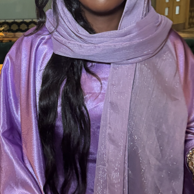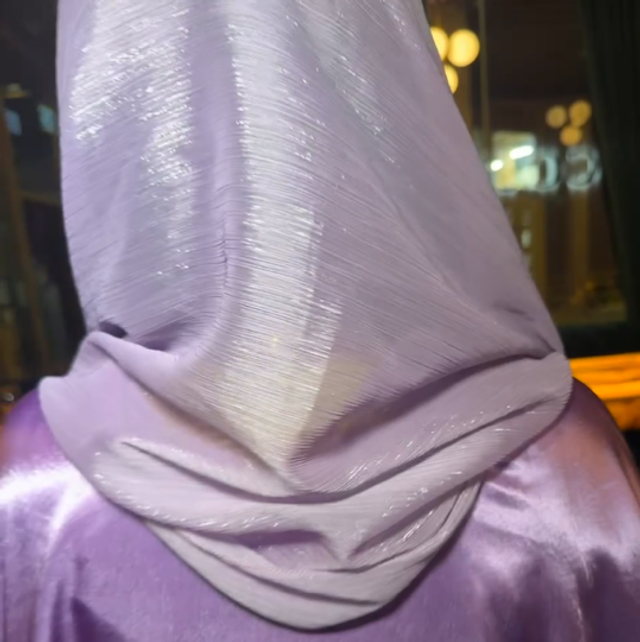 Bathed in an off-white shimmer that gleams like liquid moonlight, this set was crafted for moments that deserve all eyes on you. The flowing dress — with sleeves falling gracefully to the wrist — pairs seamlessly with an infinity loop scarf and matching undercap, creating a sculptural silhouette of elegance and power.