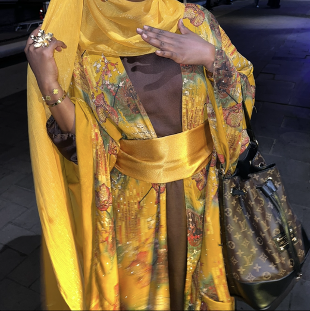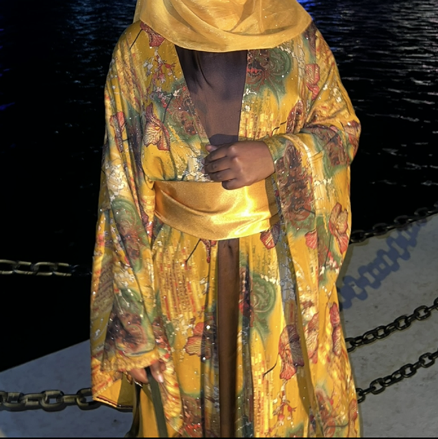 Our Hana Mustard Floral Abaya is a luxurious, one-of-one statement piece, inspired by Japanese artistry. The soft mustard fabric is adorned with iridescent silver stones that catch the light, while super-long flared sleeves and a satin belt sculpt a flowing, dramatic silhouette.