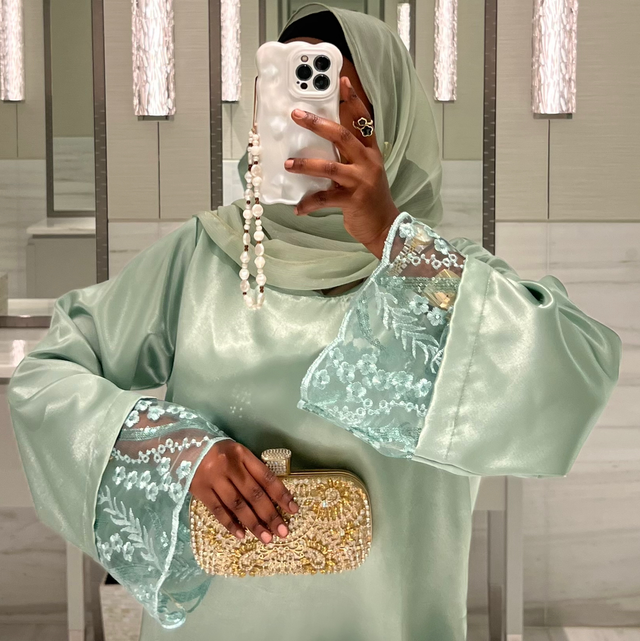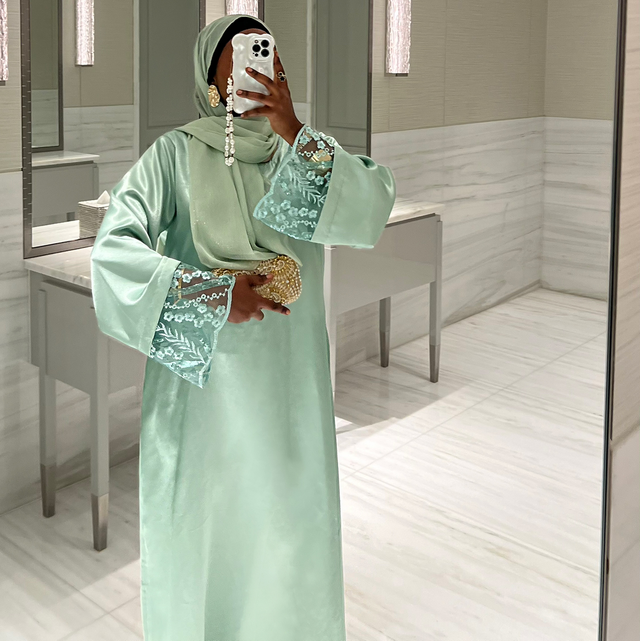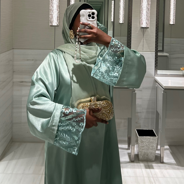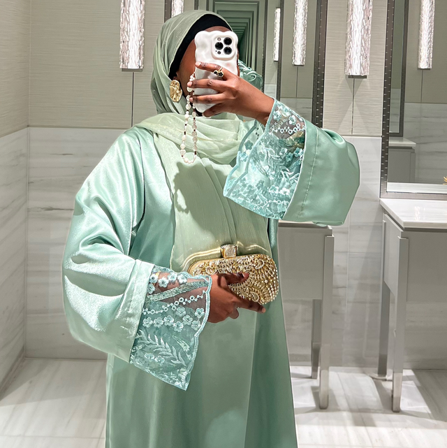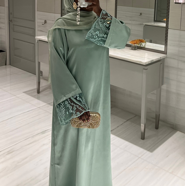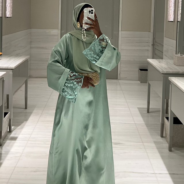 Our Sabrine Abaya in Oceanic Mint Silk is luminous and refined. The airy silk glides effortlessly, creating movement that feels weightless yet intentional. Its soft sage tone reflects freshness and renewal, perfect for Eid morning elegance.
