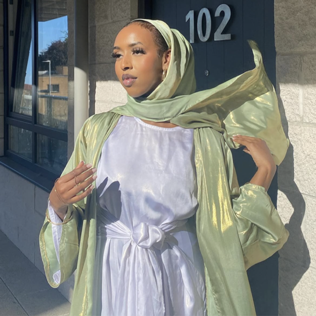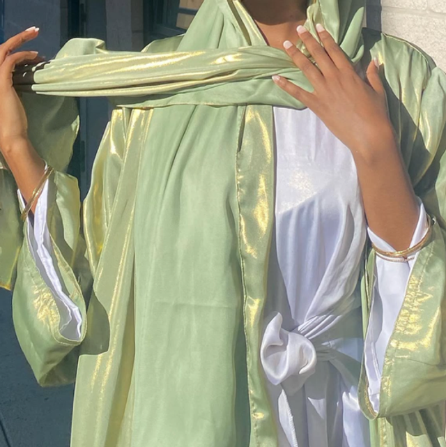 Our Glimmer Silk Abaya is a luxurious and elegant staple, designed to bring radiant flow and effortless sophistication.