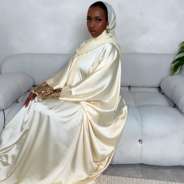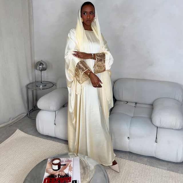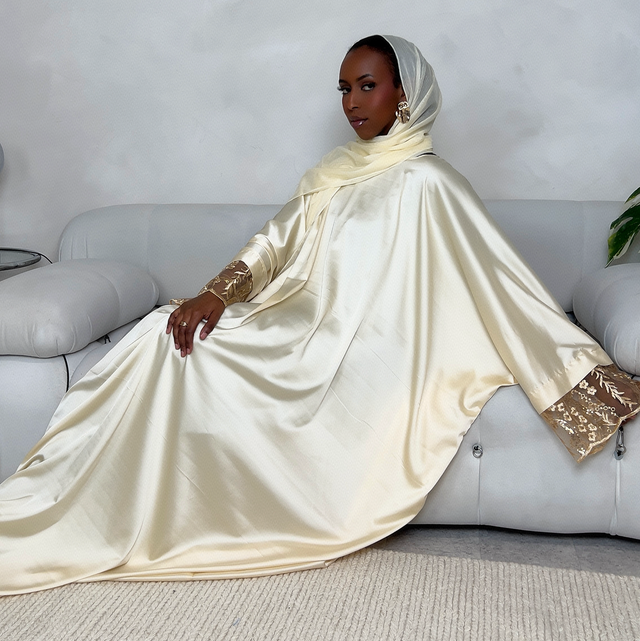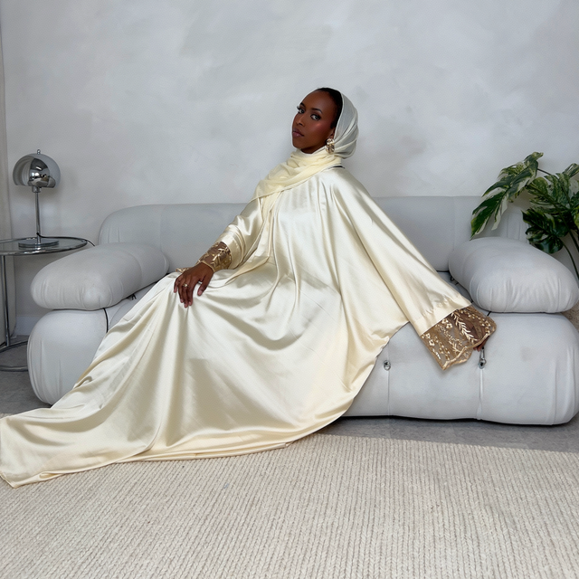 Solstice embodies luminous restraint. Crafted from fluid silk in a soft cream hue, it drapes with effortless elegance while gold lace cuffs frame the silhouette with quiet opulence. The contrast of smooth silk and intricate lace creates depth without excess.
