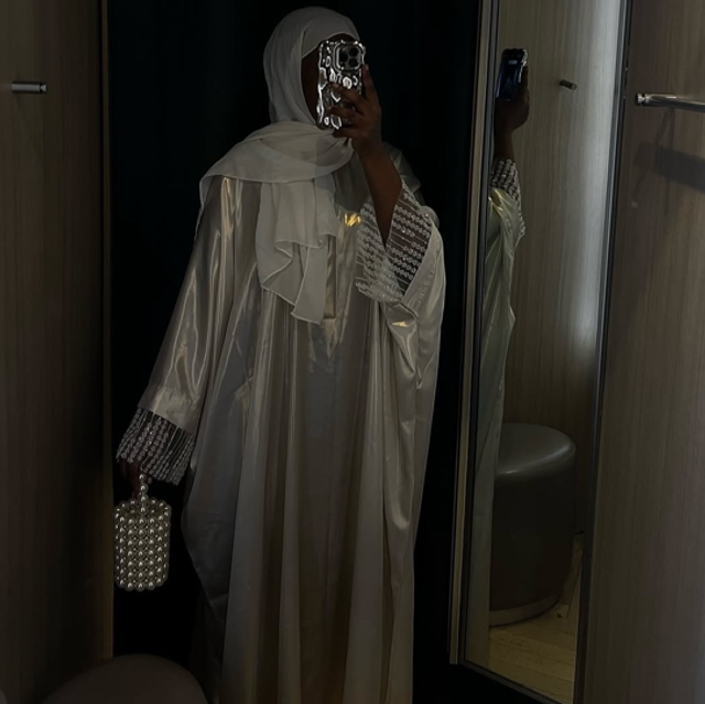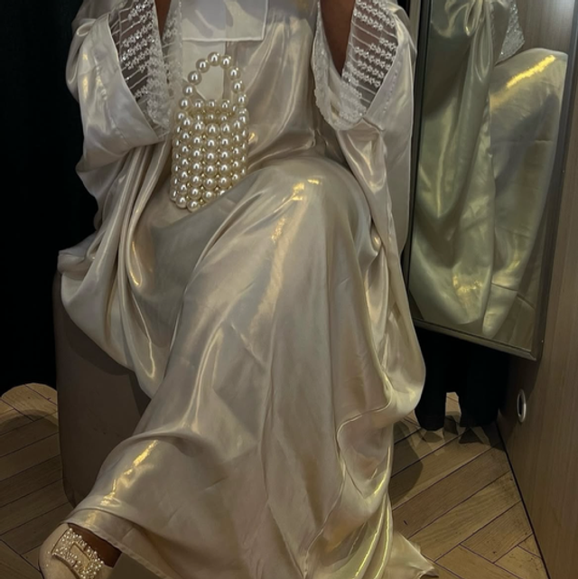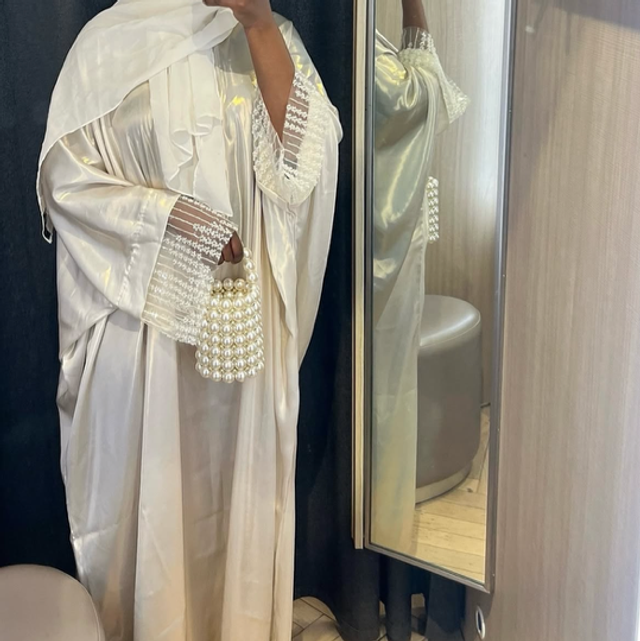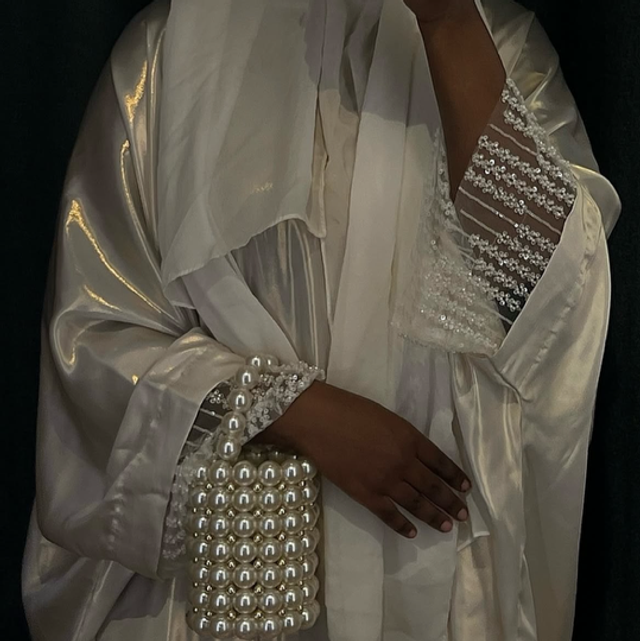 Our glimmer abaya in white with couture sleeves perfect for brides and nikkah.