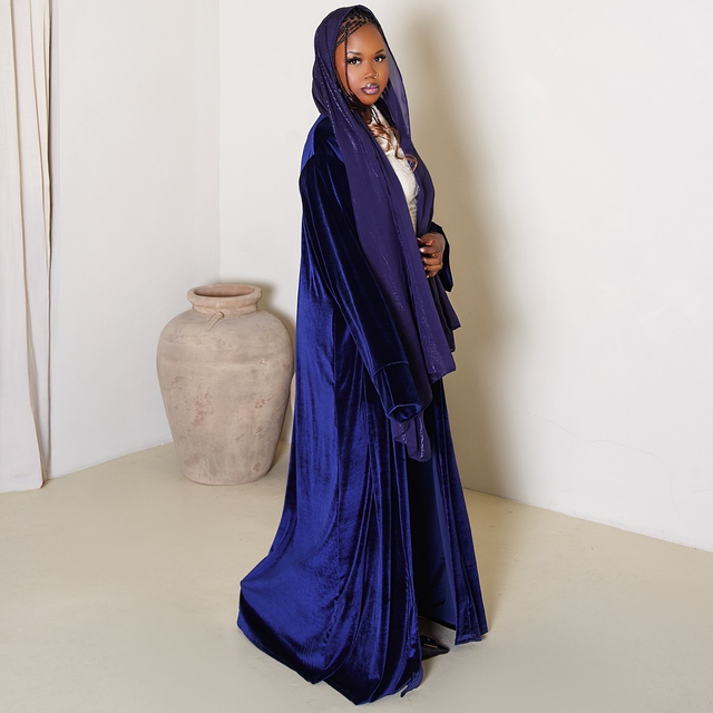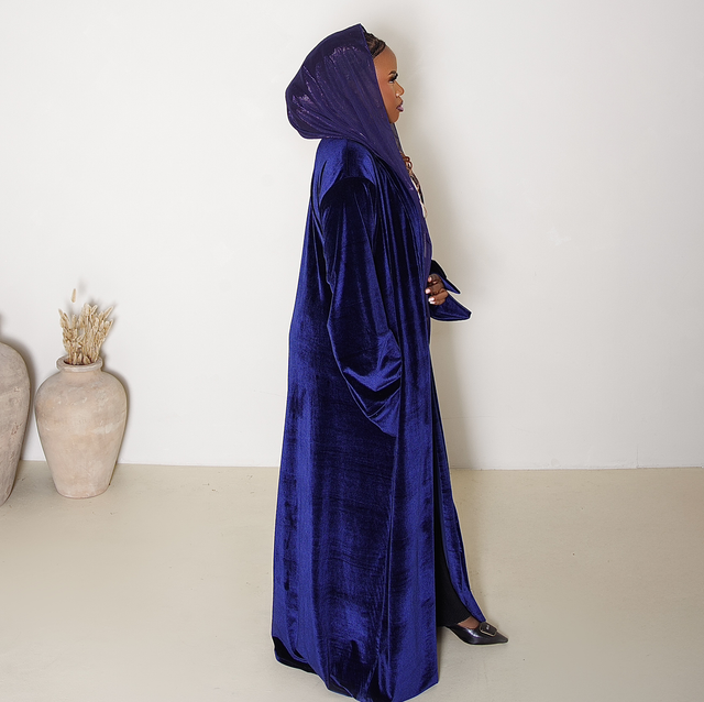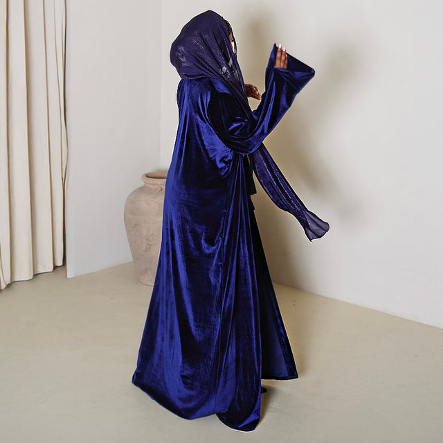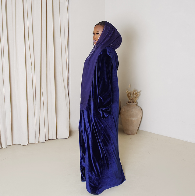 Our Velór Abaya in Twilíght embodies quiet sophistication. The deep navy hue, the perfect autumn evening shade, reflects depth and confidence, while sumptuous velvet adds an understated touch of luxury — ideal for day-to-night elegance.