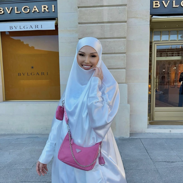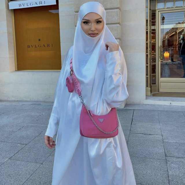 A symphony of silk and shimmer — The Silk Abaya is the epitome of refined elegance. Crafted for the woman who commands presence without ever needing to shout, this piece drapes like poetry and moves like light.
